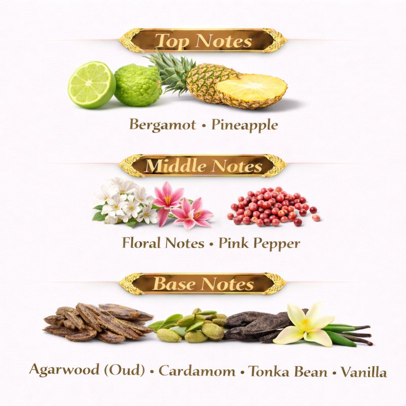 A heavenly blend of delicate florals and sweet spices that soften the traditional intensity of oud