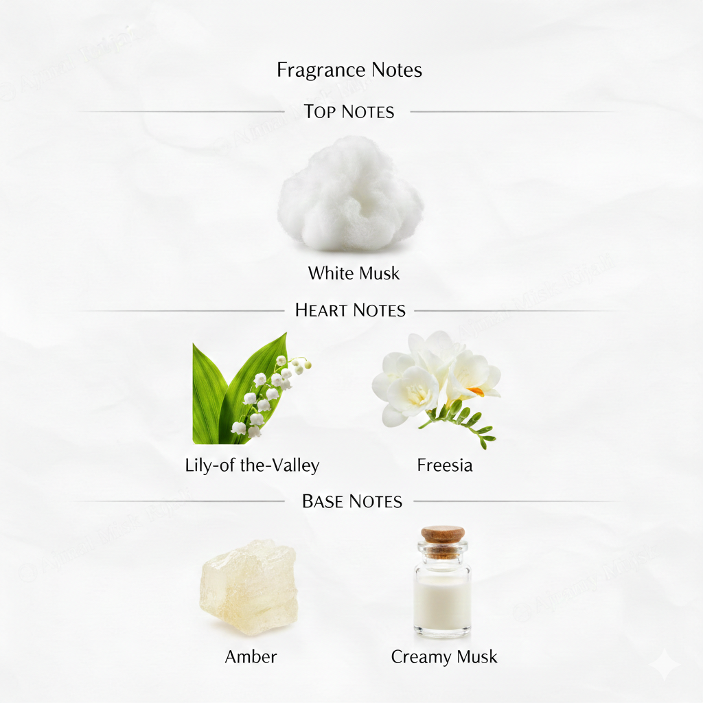A pristine composition of pure white musk, soft lily-of-the-valley, and freesia